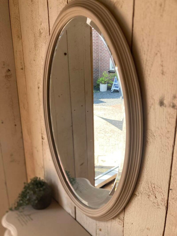 Gerestylde grenen haltafel met bijpassende spiegel. Geschilderd in de kleur Cathedral Taupe van Fusion Mineral Paint. Een romantische touch aan gegeven door de transfer met sierlijk letters.