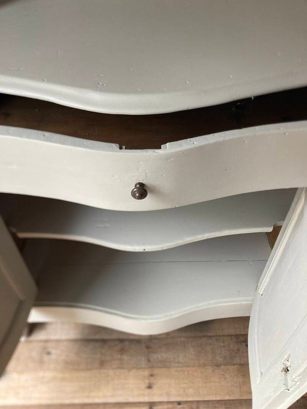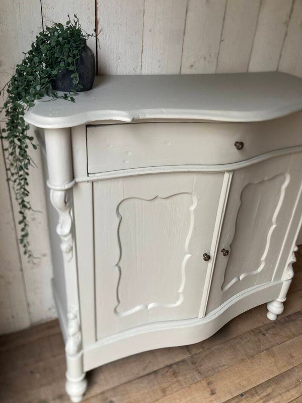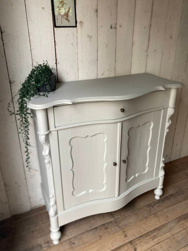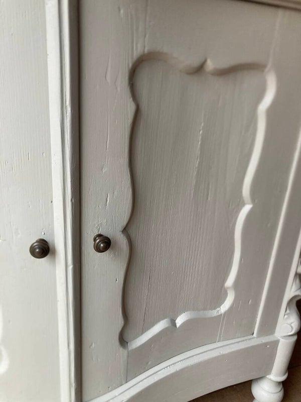 Prachtige ruime Biedemeier kast gerestyled. Gemaakt van grenen hout, een echte oude kast, met karakter. Geschilderd in de kleur Putty, van Fusion Mineral Paint, een lichte beige kleur met een grijzige ondertoon. Heeft houtworm in gezeten dit is te zien aan de gaatjes die je hier een daar nog ziet, dit geeft de kast zijn charme.