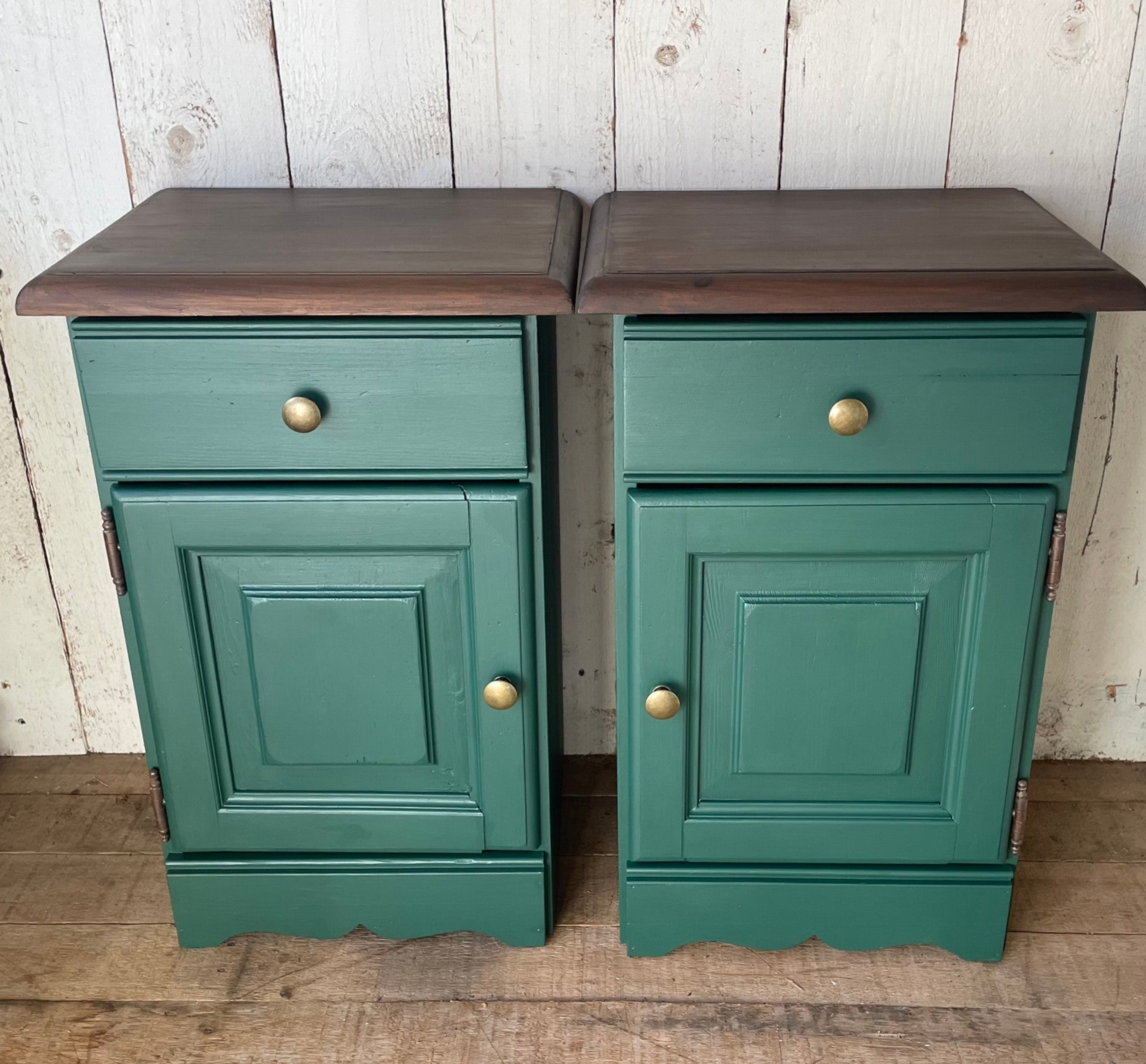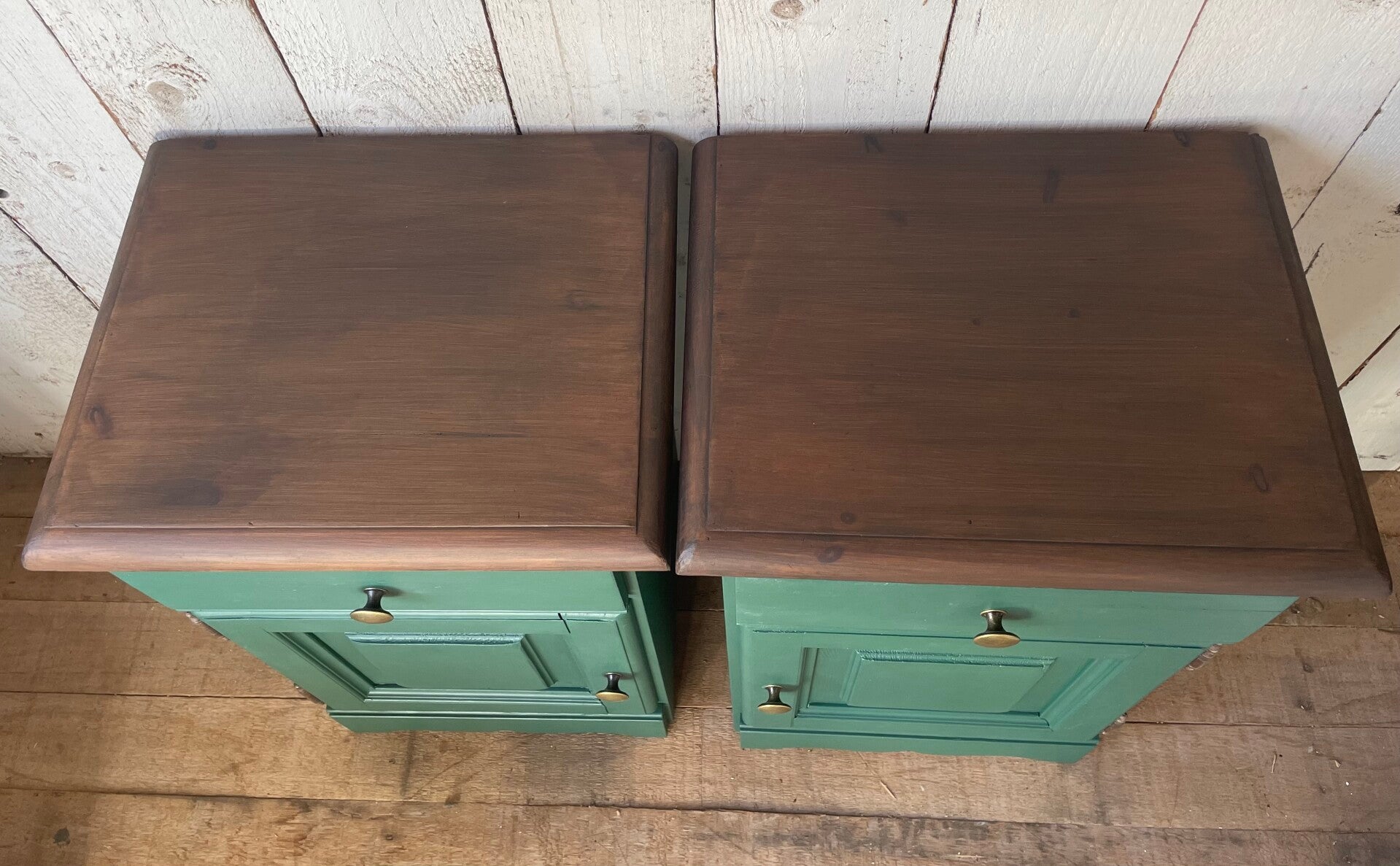 Prachtige set van twee gerestylde grenen nachtkastjes. De kastjes zijn geschilderd in de kleur Pressed Fern van Fusion Mineral Paint. Met nieuwe knoppen in bronskleur. Ze bieden handige opbergruimte met een lade en een kastje met een plank. Een aanwinst voor elk interieur!