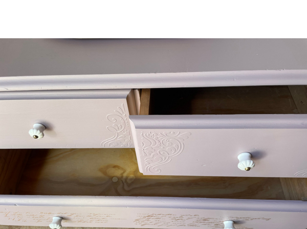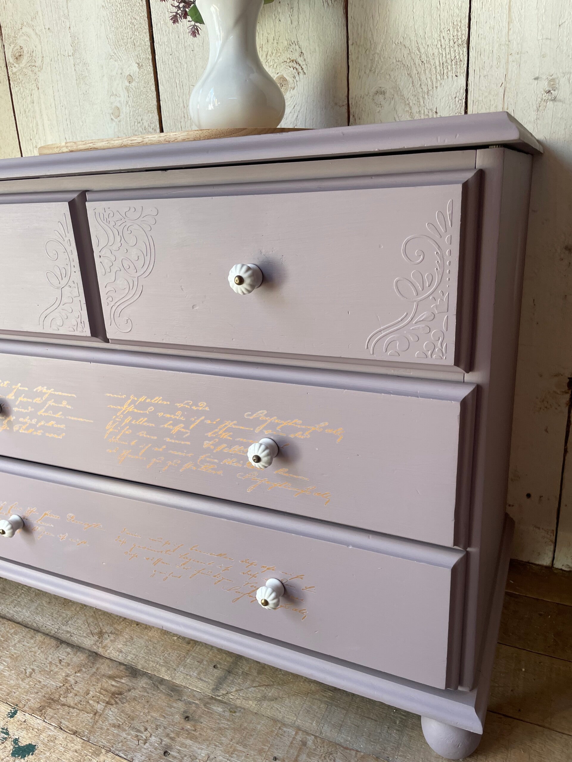Prachtige gerestylde grenen ladenkast in een zachte lavendelkleur, Lavender Haze van Fusion Mineral Paint. Deze kast is met zorg behandeld en voorzien van sierlijke details op de lades, wat zorgt voor een unieke en charmante uitstraling. Met nieuwe knoppen.
