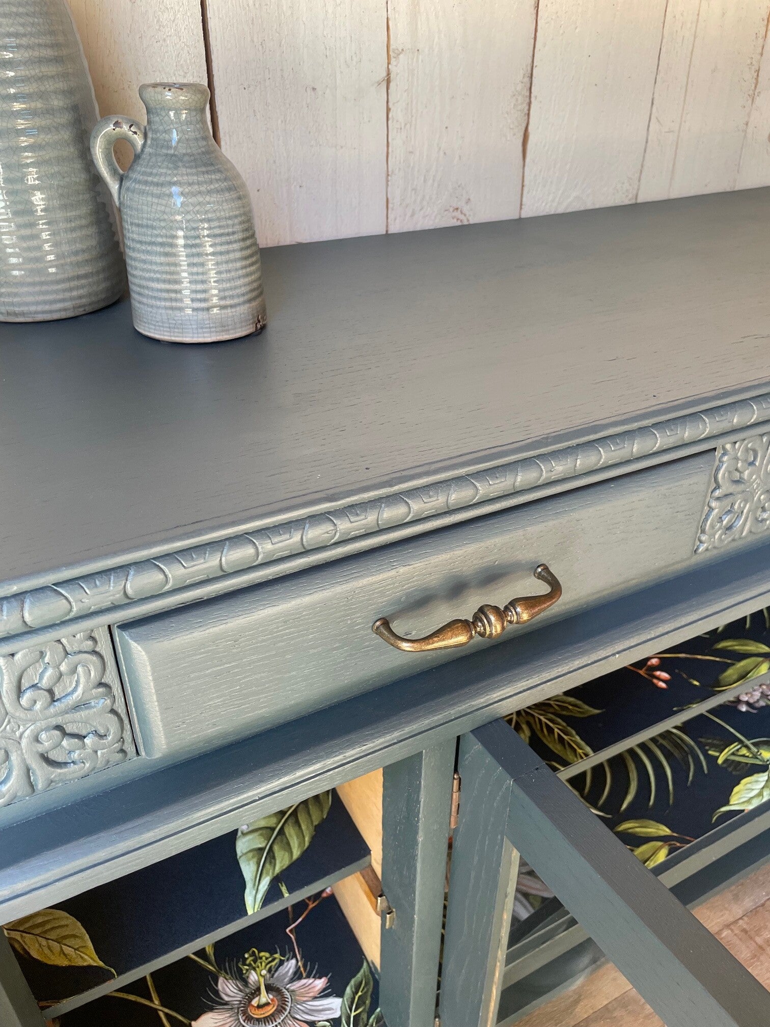 Prachtig gerestyled theekastje, in de kleur Cambridge van Fusion Mineral Paint, een warme grijs blauwe kleur. Dit ouderwetse theekastje is met zorg gerenoveerd en heeft een eigentijdse uitstraling gekregen, terwijl de originele charme behouden is gebleven. Perfect voor het opbergen van theeservies of als decoratief meubelstuk.