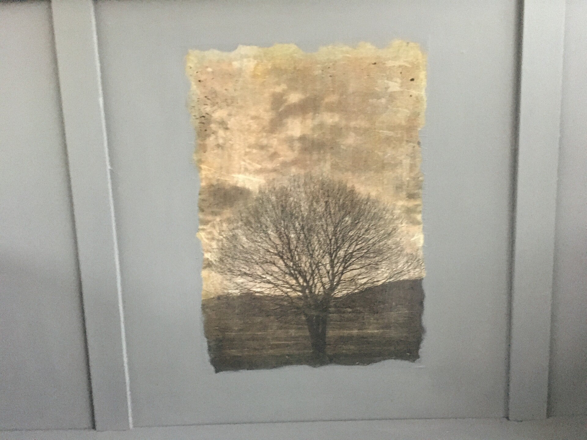 Prachtig houten bankje met decoupage (soort schilderij)in de rugleuning verwerkt. De bank is geschilderd in de kleur Astrix, een donker grijze kleur.