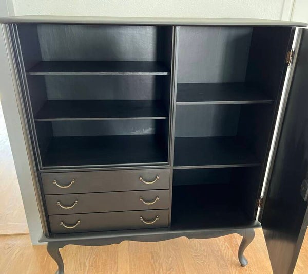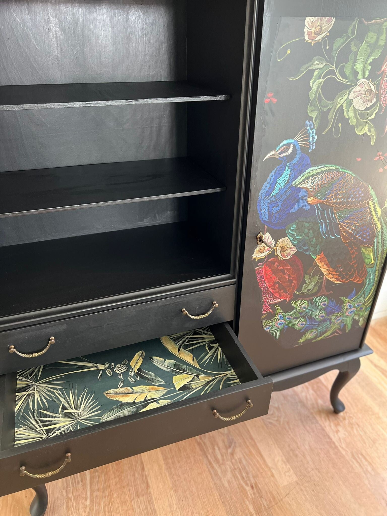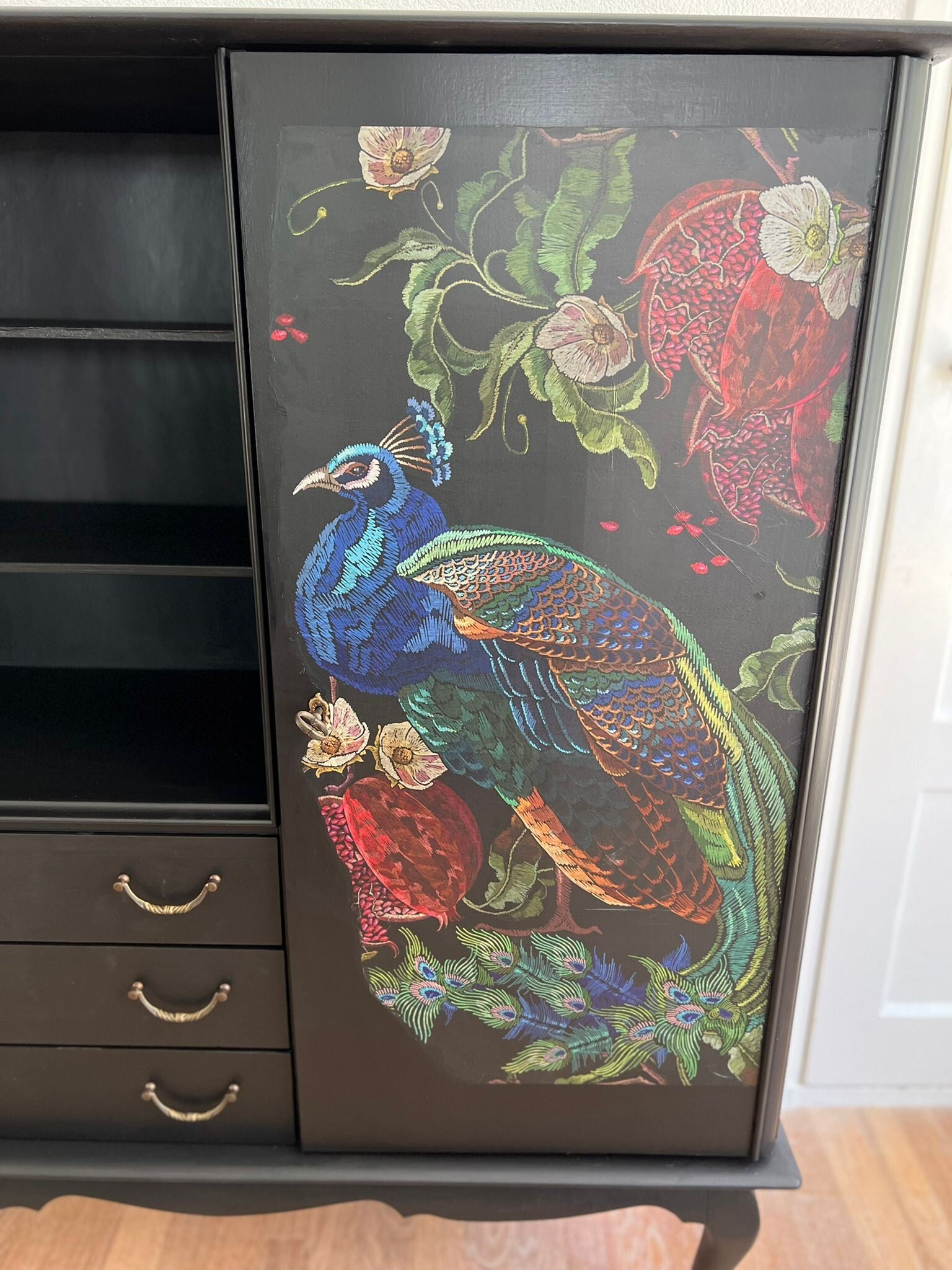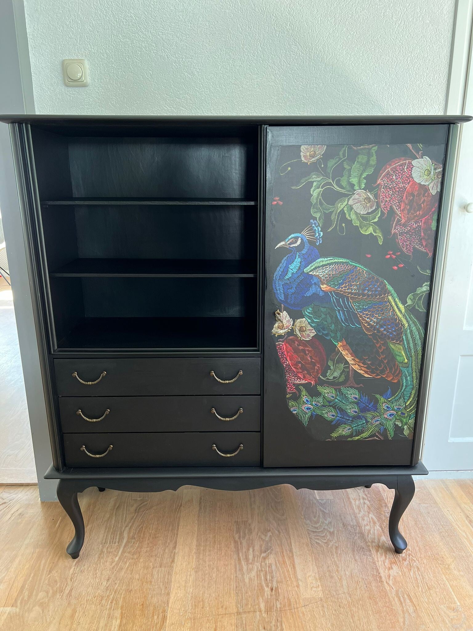 Prachtige zware kast, met Queen Ann poten. Veel opbergruimte, de lades zijn voorzien van een prachtige print, helemaal in stijl. met de Peacock decoupage van Mint by Michelle. Echt een eye-catcher.
