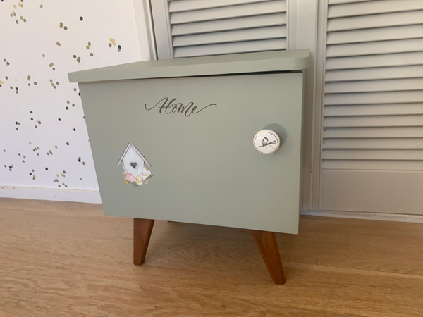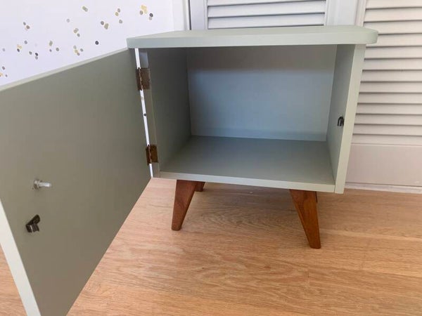 Lief klein kastje, leuk als nachtkastje of bijv. In de hal. Het kastje heeft de kleur Bellwood gekregen, een prachtige licht groen/grijze kleur. De pootjes hebben de originele kleur behouden. Hoogte: 45 cm