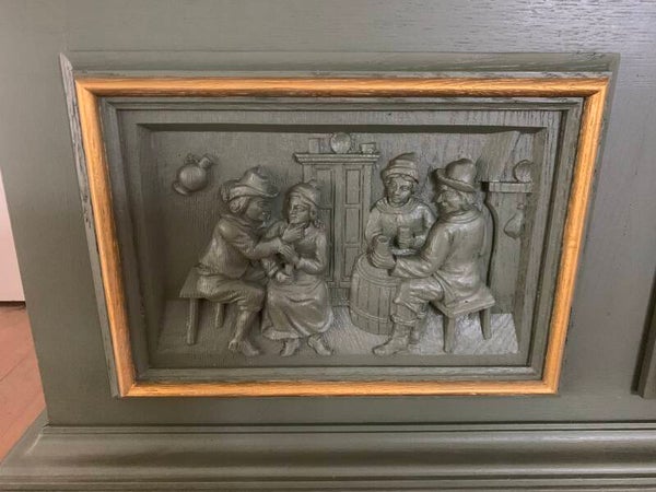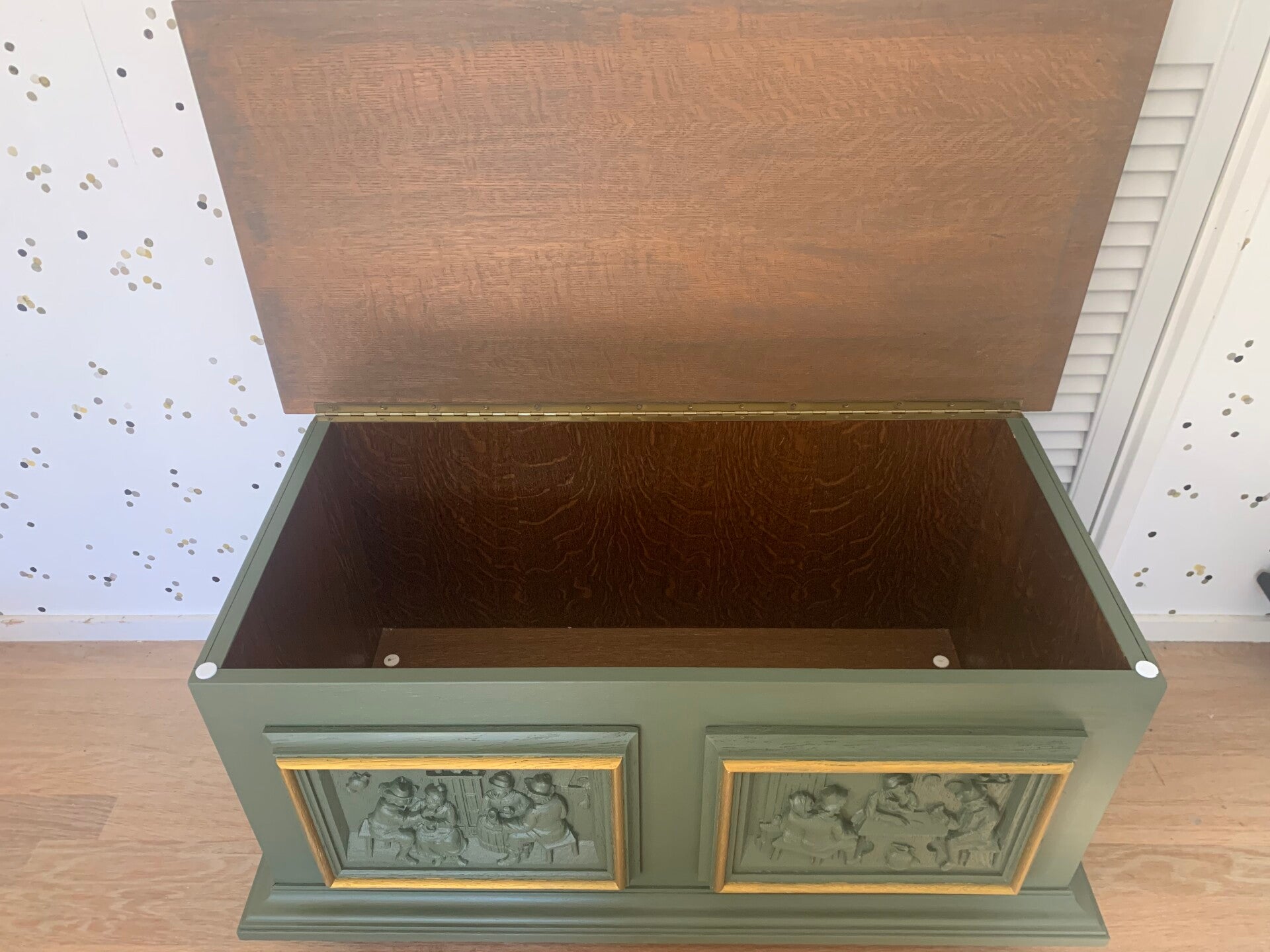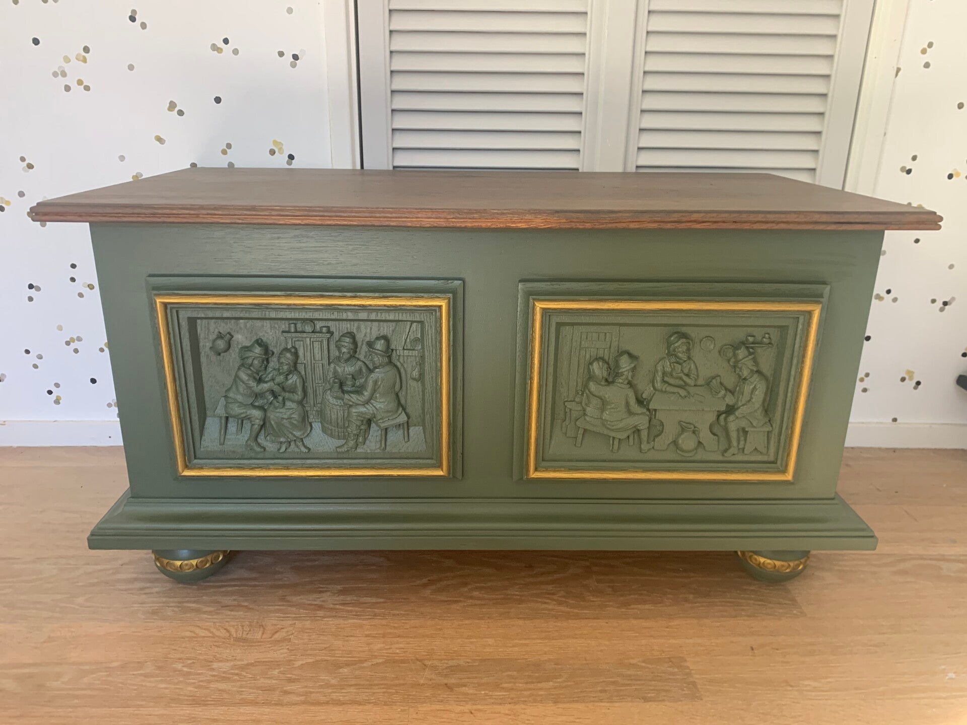 Dekenkist met prachtig houtsnijwerk. De kist heeft de kleur Bayberry gekregen, een prachtige legergroene kleur. De omlijsting en de pootjes hebben goudkleurige accenten gekregen. De deksel heeft de antiekverniswas van Maison Mansion gekregen.