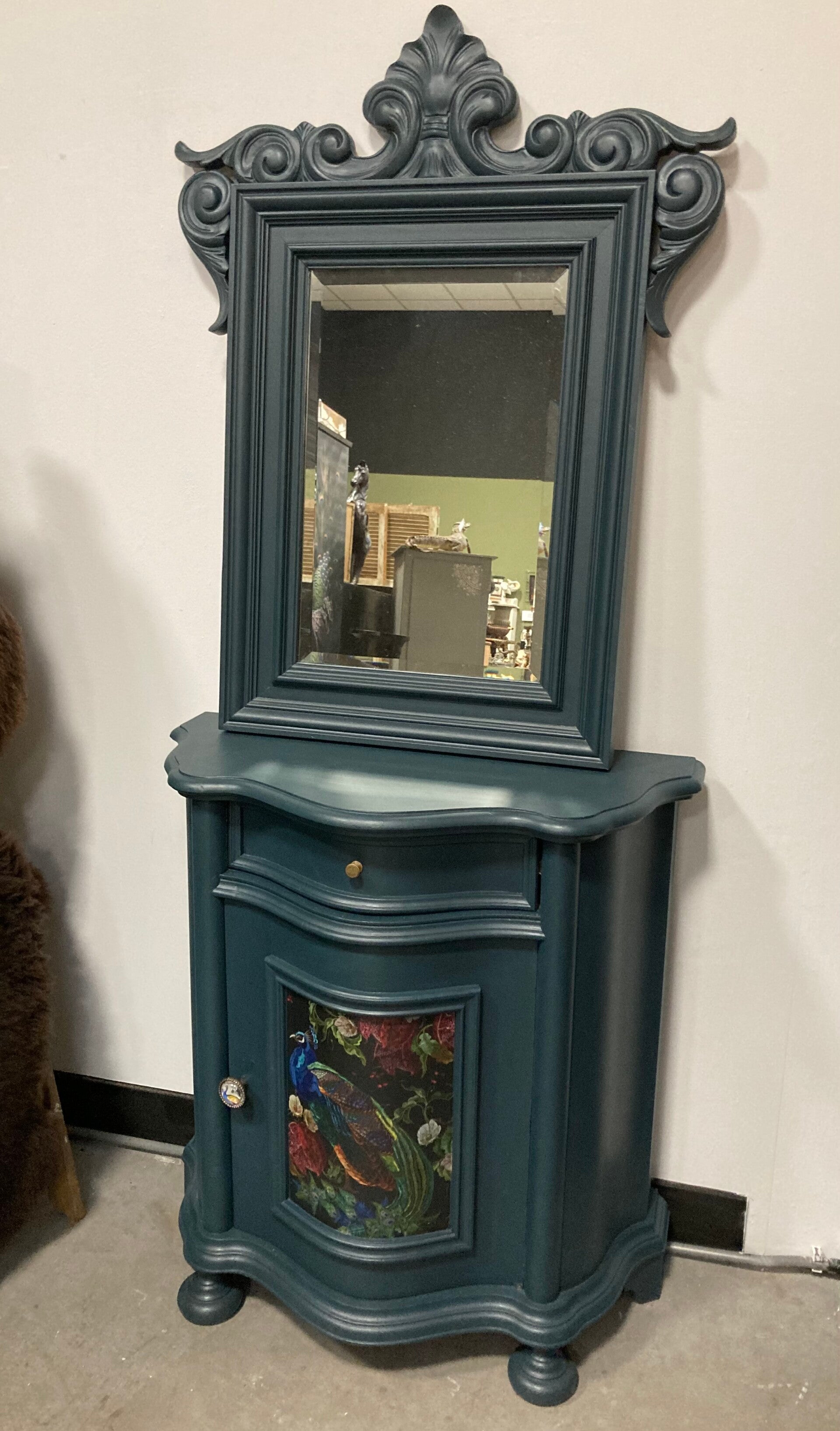 Prachtige gerestylde kast met bijpassende spiegel met houtsnijwerk. Veel opbergruimte. Geschilderd in de diepblauwe kleur Chesyler van Fusion Mineral Paint. Met de decoupage ' Peacock' van MintbyMichelle en een knop ook met een pauw.